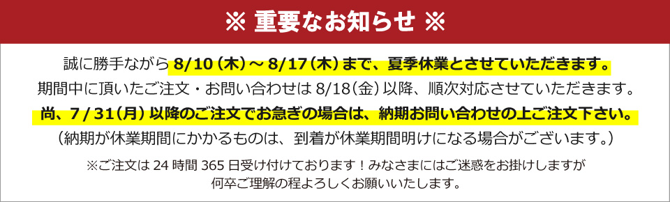 尚、7/31(月)以降のご注文でお急ぎの場合は、納期お問い合わせの上ご注文下さい。
