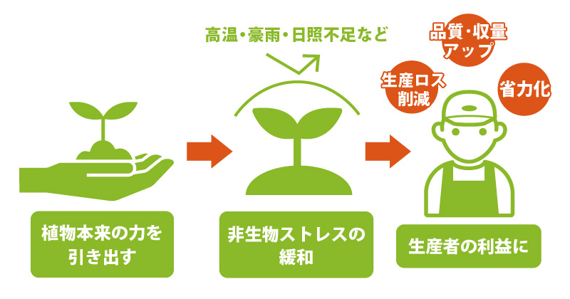 猛暑や集中豪雨、台風、暖冬などの非生物的ストレスを緩和します。