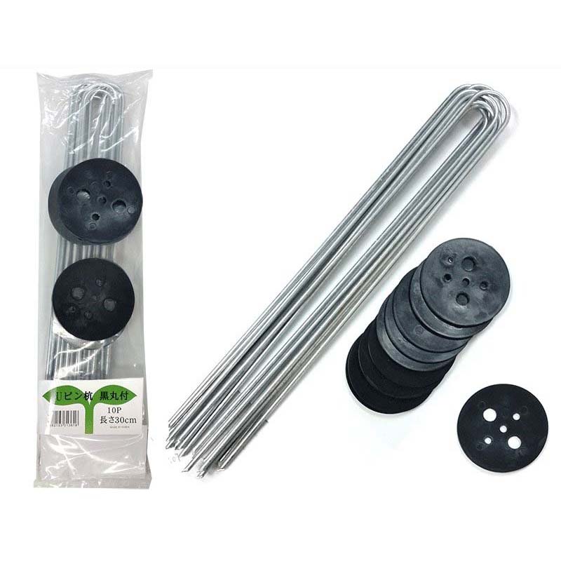 黒丸に2種類の穴があります。大きな穴に杭を通すと杭の上部が出ないので通路に最適。小さな穴に通すと抜き差ししやすくベタ掛け栽培に最適です。ピンが黒丸にはめ込まれたタイプも販売されています。