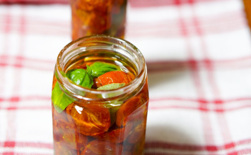 ③乾燥が終わったら煮沸消毒した瓶などに入れ、ドライトマトがしっかり漬かるまでオリーブオイルを入れたら完成