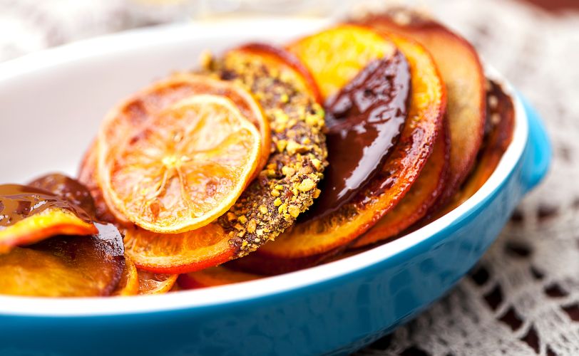 ①オレンジを皮がついたまま薄い輪切りにする。