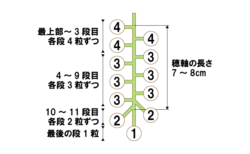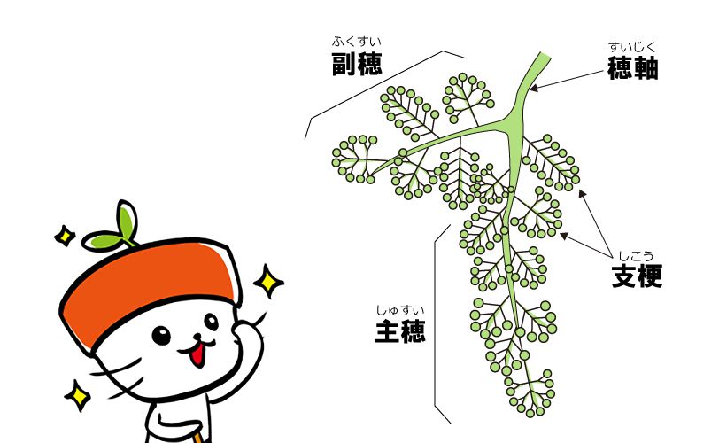 ・主穂:穂軸から分岐した枝で、一番太い枝に形成される実のこと。