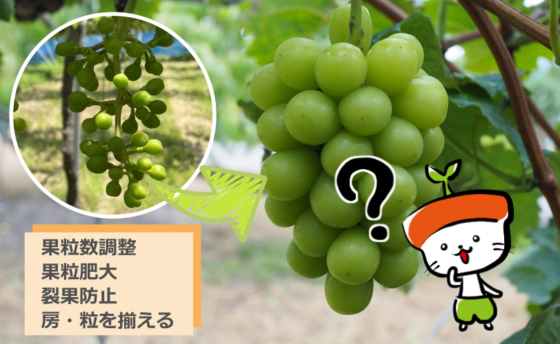 残した果粒の肥大を促進したり、房の形や粒ぞろいを揃えたり、裂果を防止する効果があります。