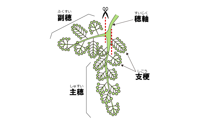 主穂を残して副穂や余分な支梗を切り取って穂軸の長さを調整する作業です。