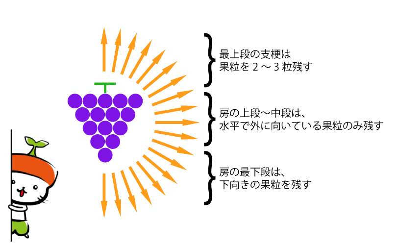 ・房の最下段は上向きの果粒を摘粒し、下向きの果粒を残すようにする。