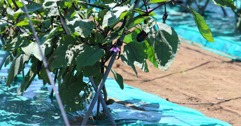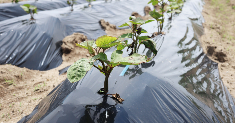 地中の温度を上昇させ、土壌の水分蒸発を抑える効果があります。光を遮断して雑草の発芽と成長を防ぎます。さらに、雨などによる土の飛び散りを防ぎ、ふんわりとした土質を維持。ナス栽培では、土壌の保湿や温度管理に役立ちます。