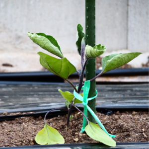 トマトの伸長を支柱に沿って誘引します。ヒモや誘引資材を使い、20~30cmの間隔でトマトの主枝と支柱を8の字で結びましょう。
