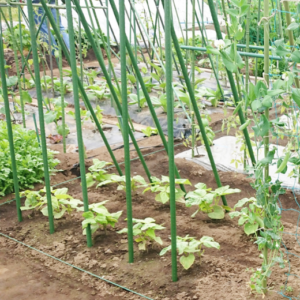 トマトは、成長すると重みで倒れてしまうことがあるので、支柱を立てて支えます。支柱立ては、定植前または定植後すぐに行います。支柱の立て方には地面に垂直に支柱を立てる「直立式」(左画像)と、屋根のように支柱を立てる「合掌式」(右画像)があります。
