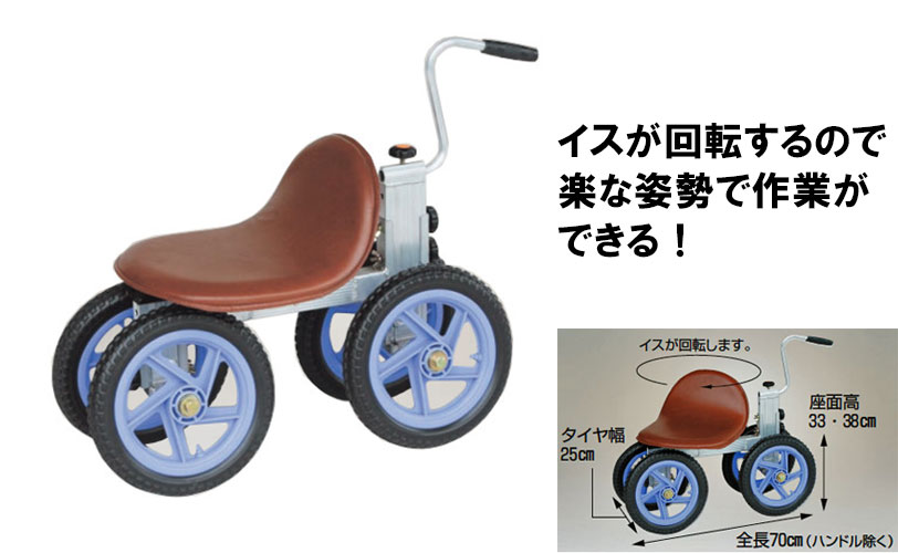 前後左右どちらの方向でも楽な姿勢で作業ができるタイプの農作業用椅子です。