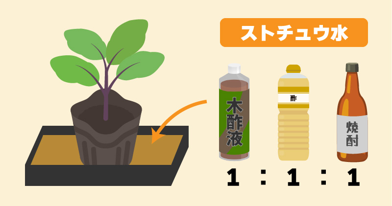 ストチュウ水は酢:焼酎:木酢液(または竹酢液)を1:1:1の割合で混ぜて作ります。