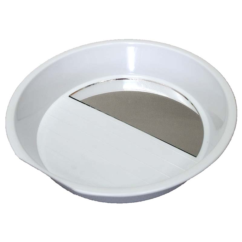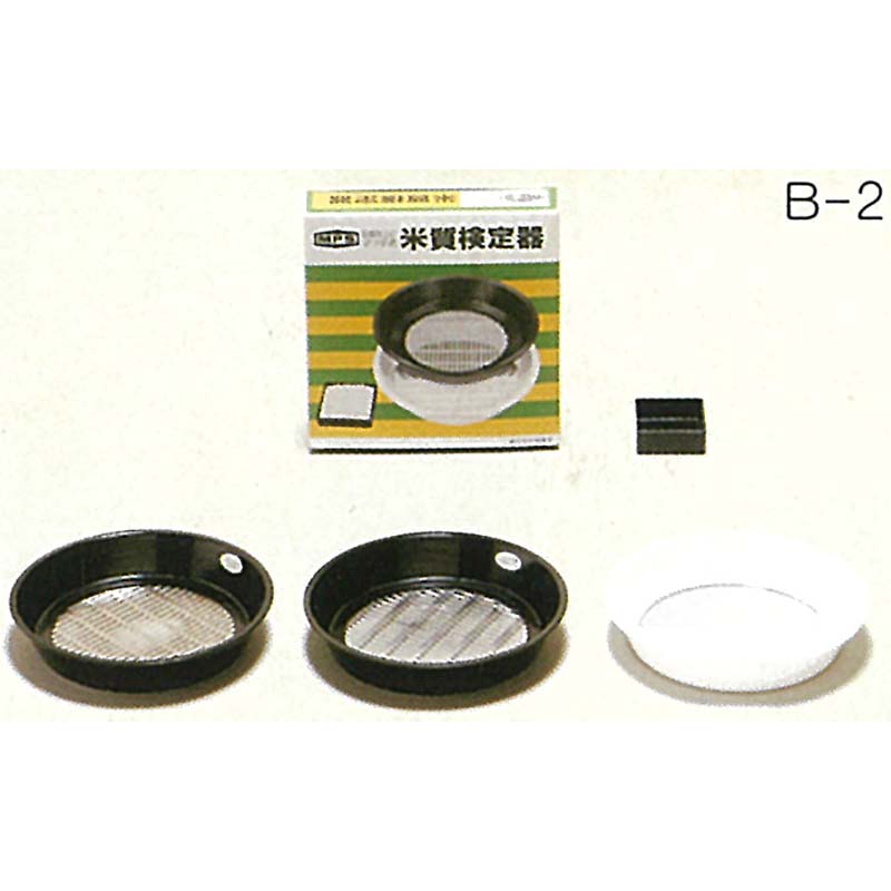 整粒に使用するフルイカルトンと、目視検査に使用する鏡付き計測カルトンがセットになっています。下から鏡付計測カルトン、フルイカルトンの目合いの小さいもの、大きいものの順で重ね、玄米を入れてふるい目に沿って平行に振り、クズ米を判別します。フルイカルトンについては、目合いのサイズを選ぶことが可能です。
