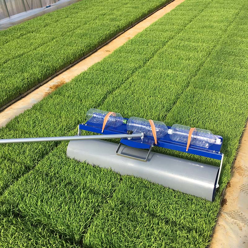 プール育苗で使用する場合、1回目だけは水を抜いてから苗踏みローラーをかけるようにして下さい。これは、発芽後1週間は根の張りが弱いのでローラーをかけてしまうと苗が抜けてしまう恐れがあるためです。2回目以降は通常通り水を張ったままローラーをかけても問題ありません。