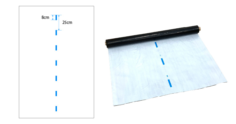 マルチ表面(白側)には、中央に一定の間隔で青のラインが入っているので、
