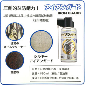 アイアンガード:吹き付けると表面に防錆膜を作り、サビの発生を予防。刃が濡れていても、しっかり表面を保護します。潤滑剤としても使用可能。
