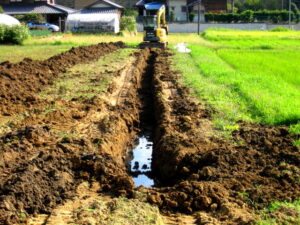 明渠が目に見えるのとは逆に、暗渠は畑に深い穴をほって地中に排水パイプの施工する方法です。