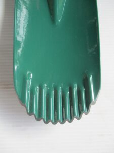 強靭でサビに強いステンレス鋼と軽量のアルミハンドルを適材に使用しました。ステン皿は丈夫な3か所の突起(溝)加工です。先端には「根きり」のできるギザ刃(片側)が付いてます。