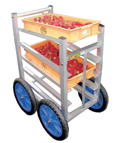 高設用移動式作業椅子。 | イチゴ用収穫台車。 | 立ったまま楽な姿勢で | 宙吊り包装で | トレー用緩衝材。 |