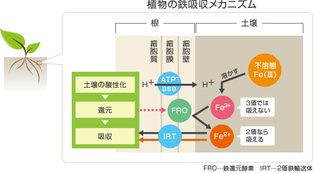 植物は酵素を出して、三価鉄イオンを二価鉄イオンに変化させることで、根から鉄分を吸収します。