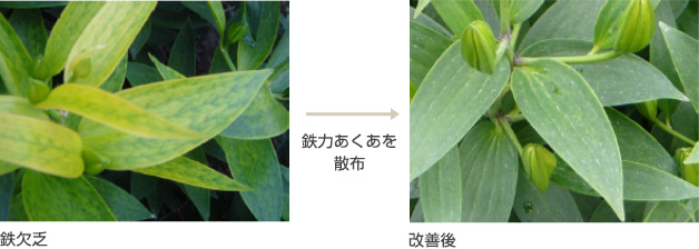 下の画像は、鉄欠乏のユリに鉄力あくあを散布し、葉色が改善した様子。