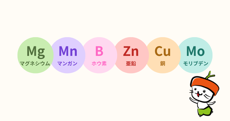 二価鉄のほかに「マグネシウム・マンガン・ホウ素・亜鉛・銅・モリブデン」が含まれています。