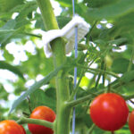 ひもで8の字で枝を支柱に誘引します。1番目の実ができ始めたら、